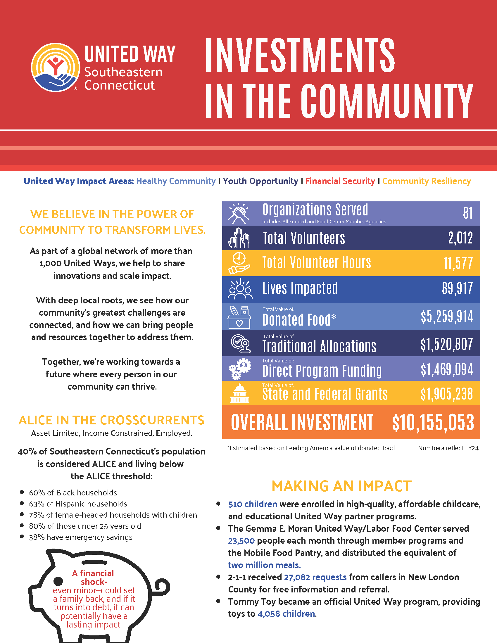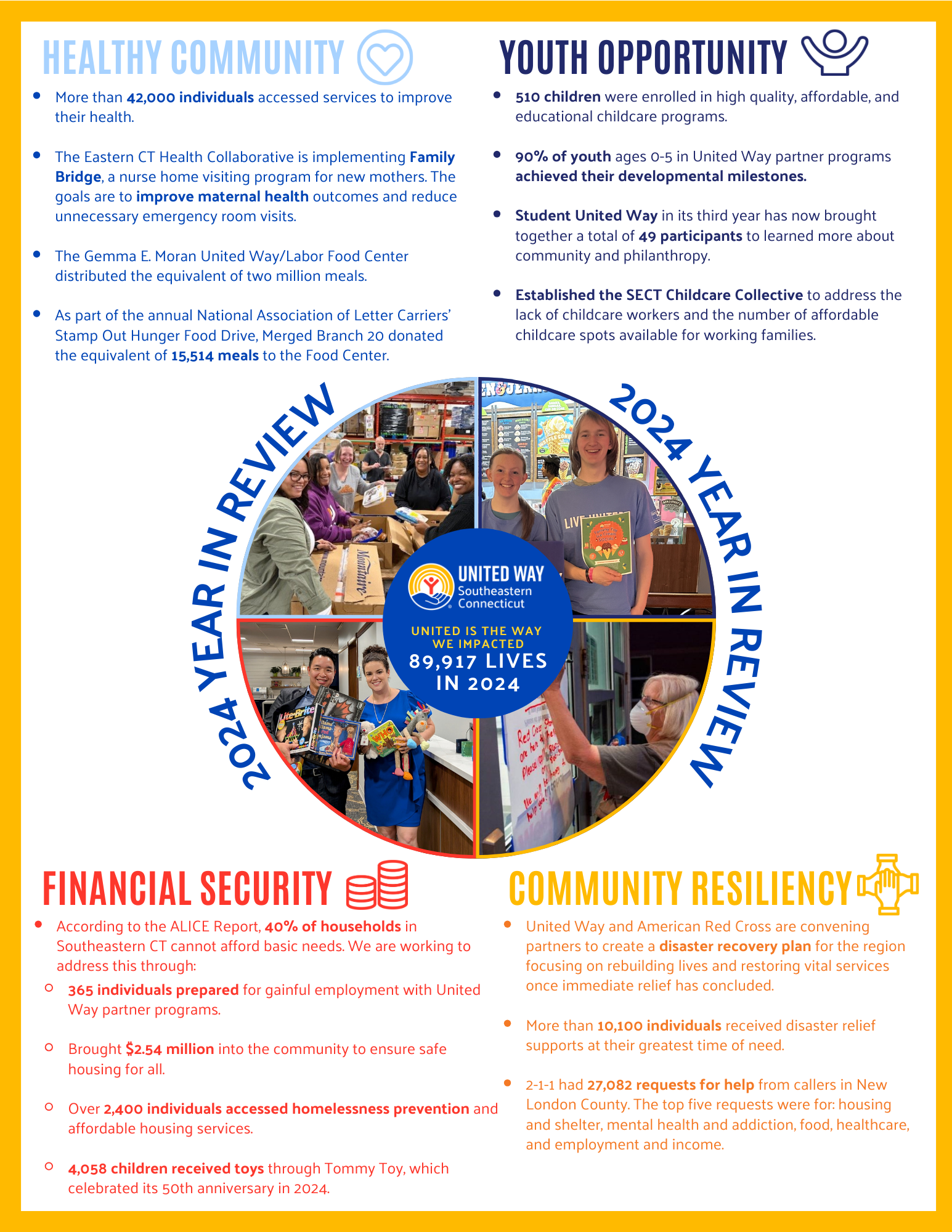 United Way of Southeastern Connecticut’s four impact areas are: Healthy Community, Youth Opportunity, Financial Security, and Community Resiliency.