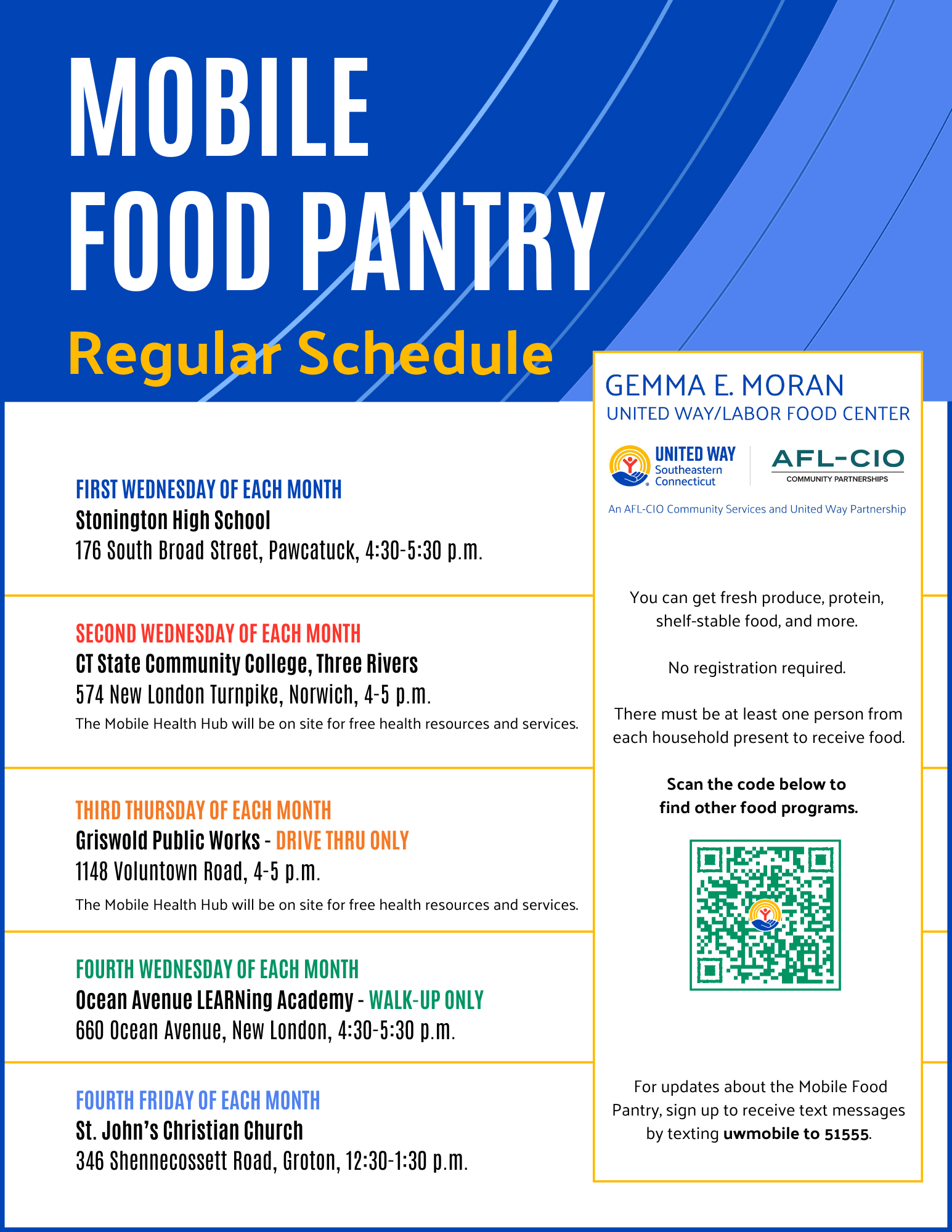 - Promote opportunities to employees including Day of Caring projects and volunteering at the Gemma E. Moran United Way/Labor Food Center and Mobile Food Pantry. All volunteering can be arranged through United Way.