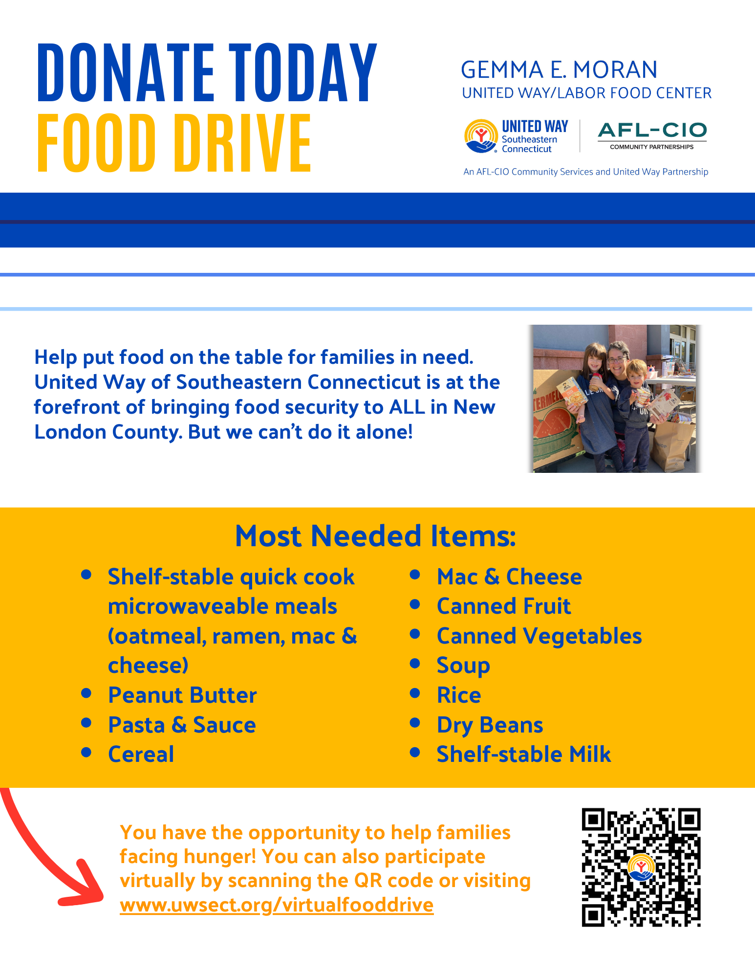 Whether or not you can deliver the food yourself, call the Gemma E. Moran United Way/Labor Food Center at 860.444.8050.