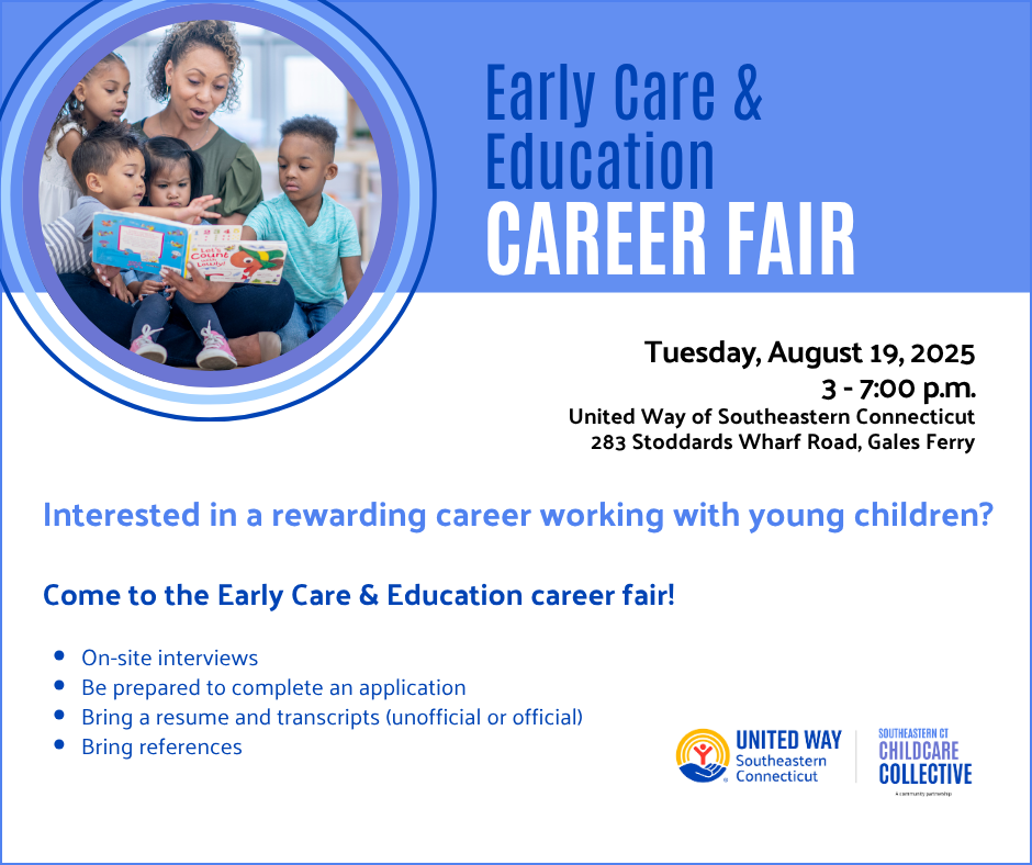 United Way of Southeastern Connecticut is hosting an Early Care & Education Career Fair on Tuesday, August 19, 2025, from 3:00 to 7:00 p.m. at the United Way office, located at 283 Stoddards Wharf Road, Gales Ferry.